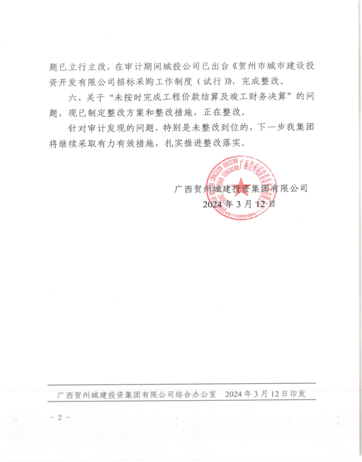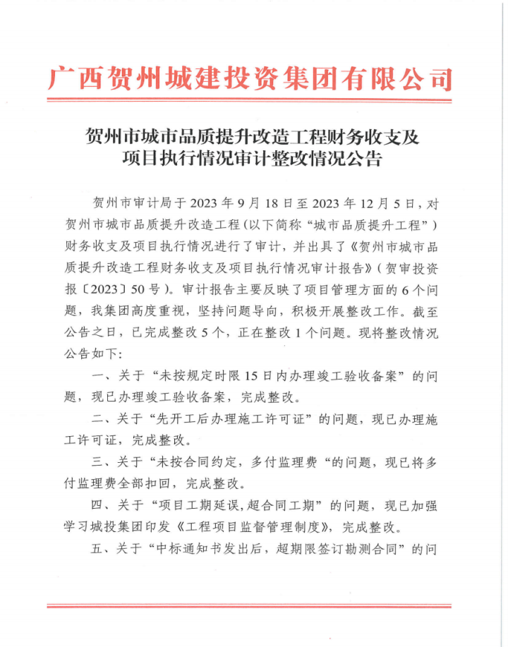 上一篇:廣西賀州城建投資集團有限公司2022年度財務(wù)收支情況審計整改情況公告