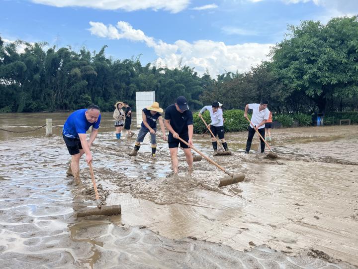 近日,我市遭遇強降雨,賀江水位迅猛上漲,城區部分區域范圍遭受不同程度的災害影響,沿江而建的北堤公園因河水上漲也被洪水淹沒(méi)。隨著(zhù)洪水退去,大量淤泥、雜物殘留在北堤公園河岸兩側。為盡快恢復北堤公園美麗整潔面貌,6月16日,城市運營(yíng)公司副總經(jīng)理劉立忠率領(lǐng)城投物業(yè)公司全體干部職工攜帶高壓水管、鐵鏟、掃帚等工具趕赴北堤公園內澇路段清理積水、淤泥。