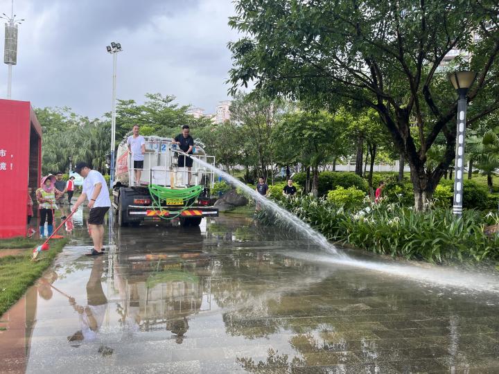 本次清理行動(dòng)分兩組進(jìn)行,一是加大路面保潔作業(yè)力度,對散落的樹(shù)枝、落葉及洪水攜帶上來(lái)的雜物進(jìn)行清理。二是人機結合,采取“沖洗+洗掃”聯(lián)合作業(yè)方式,對林蔭小道路面、公園廣場(chǎng)等地進(jìn)行深度沖洗,徹底消除洪水沉積淤泥。